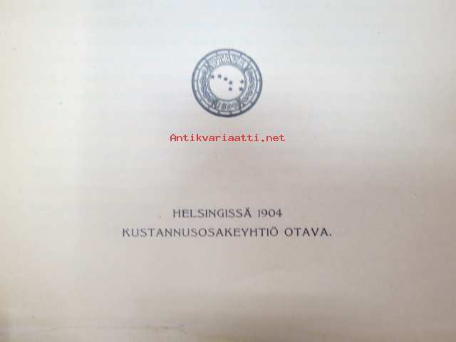 | Saatavilla | 1 kpl | | Julkaisuvuosi | 1904 | | Sivuja | 237 | | Painos | 1. | | Kunto | K3 | | Sidonta/painoasu | Sidottu (kovak.) | | Kielet | Suomi |