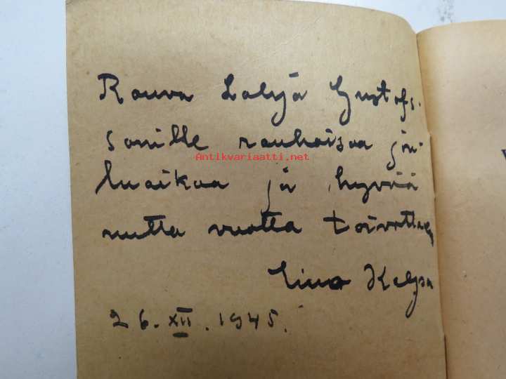 | Saatavilla | 1 kpl | | Julkaisuvuosi | 1944 | | Sivuja | 73 | | Painos | 7. | | Kunto | K3 | | Sidonta/painoasu | Nidottu (pehmeäk.) | | Kielet | Suomi |