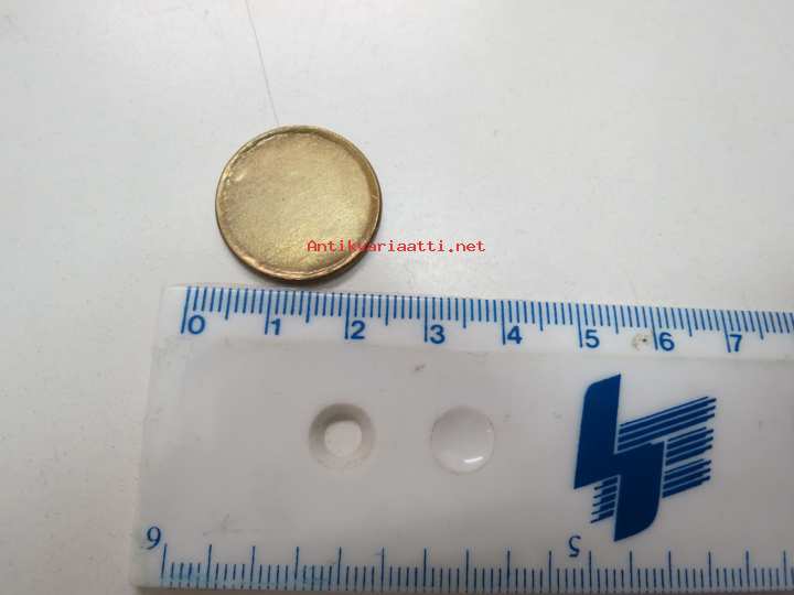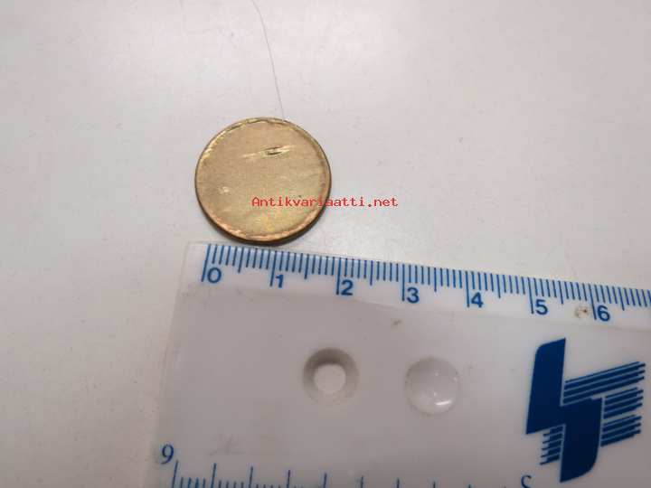 20 mm, "itsetehty"? Erikoinen, osin pinta noussut rypyille, 2-kerrosmetallia? Pyöristetty reuna.
