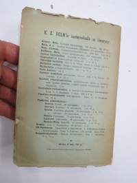 | Saatavilla | 0 kpl (Huom. tuote on myyty! / Sold out!) | | Julkaisuvuosi | 1897 | | Sivuja | 182 | | Painos | 1. | | Kunto | K2 | | Sidonta/painoasu | Nidottu (pehmeäk.) | | Kielet | Suomi |