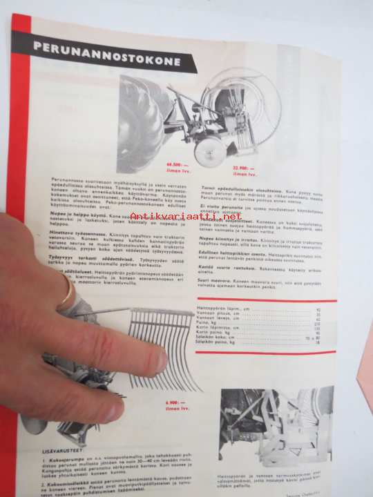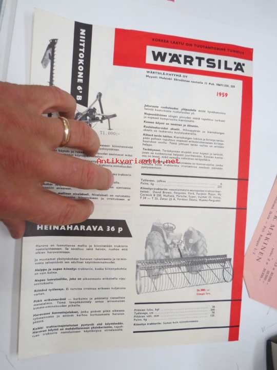 Wärtsilä 1959 Niittokone 6`B, Heinäharava 36 p, perunannostokone -myyntiesite