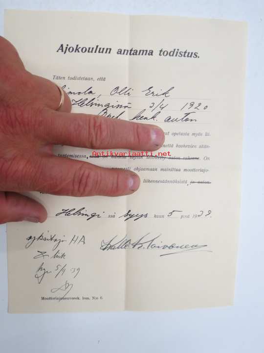 Ajokoulun antama todistus, Olli Erik Simola on saanut opetusta Opel-henkilöauton kuljettamisessa yhteensä 12 tuntia, Helsinki 5.9.1939