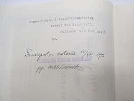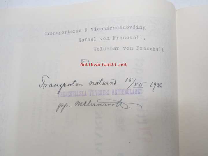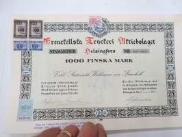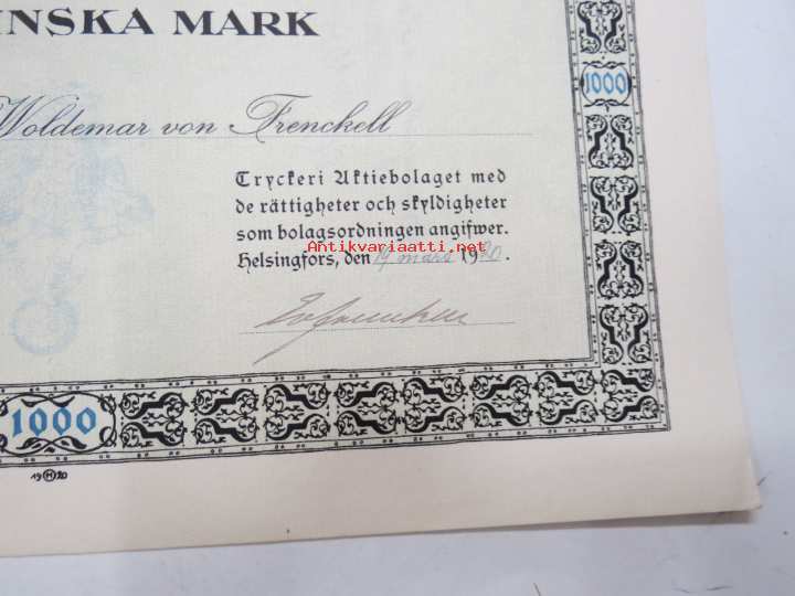 Frenckellska Tryckeri Aktiebolaget, Helsingfors 1920, 1000 fmk stamaktier nris 2077-2086, Verkl. Statsrådet Woldemar von Frenckell -osakekirja / share certificate