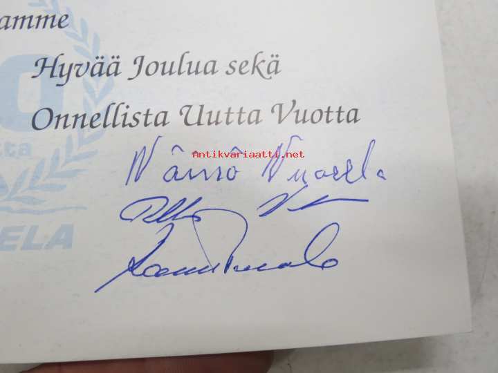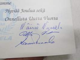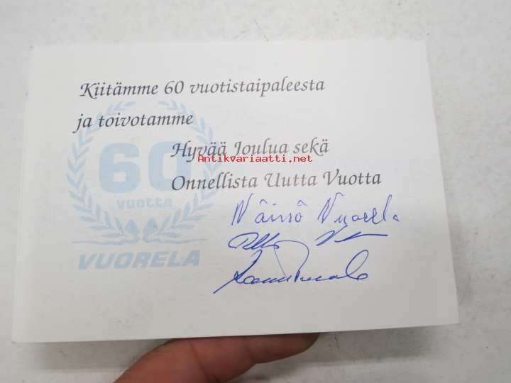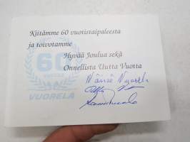 Vuorela -joulutervehdys / joulukortti & 60-vuotiskortti, kortissa omakätiset allekirjoitukset Wäinö Vuorela, Pekka Vuorela & Raimo Vuorela