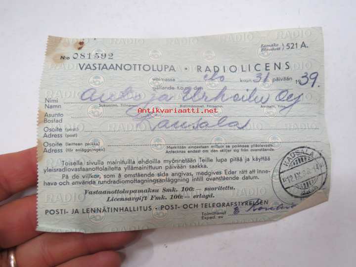 Yleisradiolaitteen vastaanottolupa nr 081592 elokuun 31 päivään 1939, Auto ja Urheilu Oy, Kausala - Radiolicens -radio licence