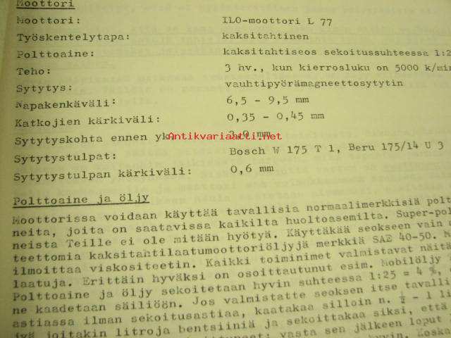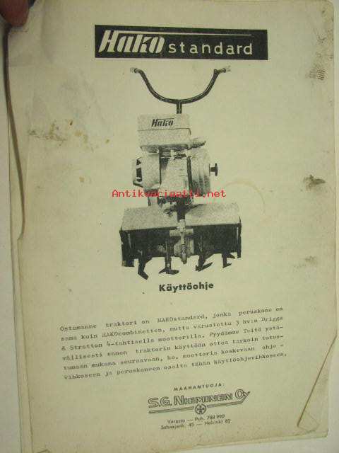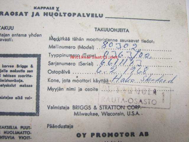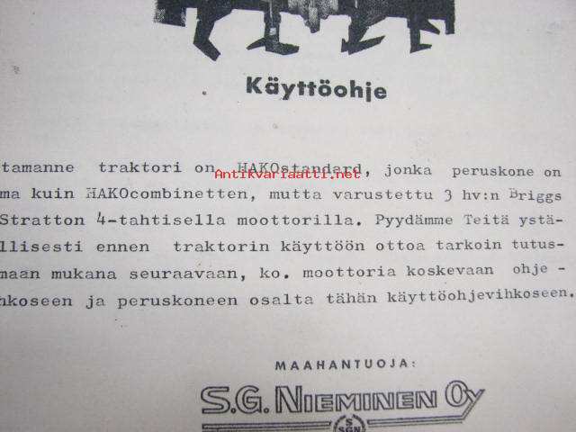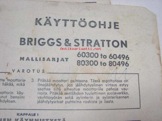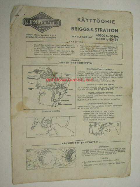 S.G. Nieminen Oy, 19 21 x 30 cm nippu. Mukana erilliset ohjeet Briggs & Stratton moottorille.