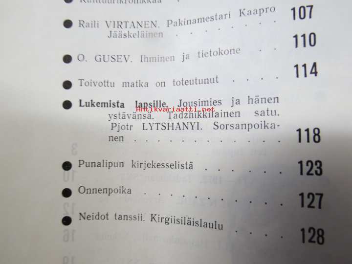 | Saatavilla | 1 kpl | | Julkaisuvuosi | 1972 | | Kunto | K2 | | Sidonta/painoasu | Lehti | | Kielet | Suomi |