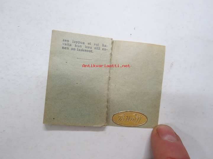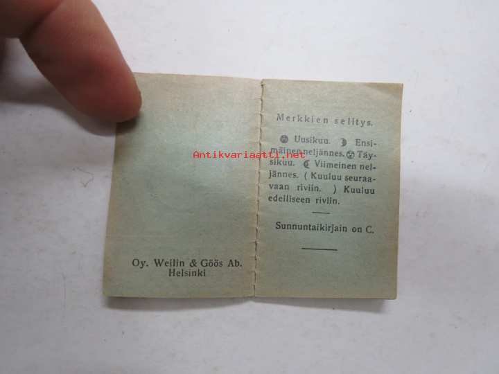 Weilin & Göös Oy, 193635 x 55 mm minikoinen kalenteri. Wulff-liimamerkki takasivulla.