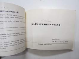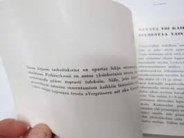 | Saatavilla | 1 kpl | | Julkaisuvuosi | 1956 | | Sivuja | 47 | | Painos | 1. | | Kunto | K2 | | Sidonta/painoasu | Nidottu (pehmeäk.) | | Kielet | Suomi |