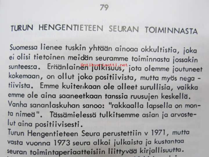 15 x 21 cm, Turun Uusi Hengentieteen Seura, näköispainos. Kirja leimataan Mestarin (Luciferiaanisen Valon kirkon Suomen Piispa, oman väittämänsä mukaisesti) alkuperäisellä nimileimasimella! Antikvariaattini osti aikoinaan (v. 2004) Pekka Siitoinin kuolinpesän massiivisen myyntikirjavaraston, dokumentit, valokuvat ym. henkilökohtaista irtainta ja tavaraa, jolloin mm. tämä leimasin tuli haltuuni.