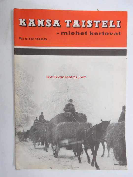 Sanoma Oy, 1959Kansa Taisteli 1959 nr 10, sis. mm. seur. artikkelit; Paavo Korven-Korpinen - Kun kansa linnoitti Karjalan Kannasta, Emil Nikkanen - Kolmasti kovilla, Arvo Seppinen - Kun taistelulaiva "Marat" ja Saarenpään linnake "haastelivat" keskenään, Leni Hoffrén - Vapaaehtoiset II-osa, Sulo Pasanen - Operaatio hirvenliha, Sirkka Tolvanen - Lotta-Schwester yöhoitajana, Veikko Moilanen - Kaksintaistelu Siiranmäellä Sotkan kanssa, R. Simonen - Sirpaleita, ym. 21 x 30 cm.