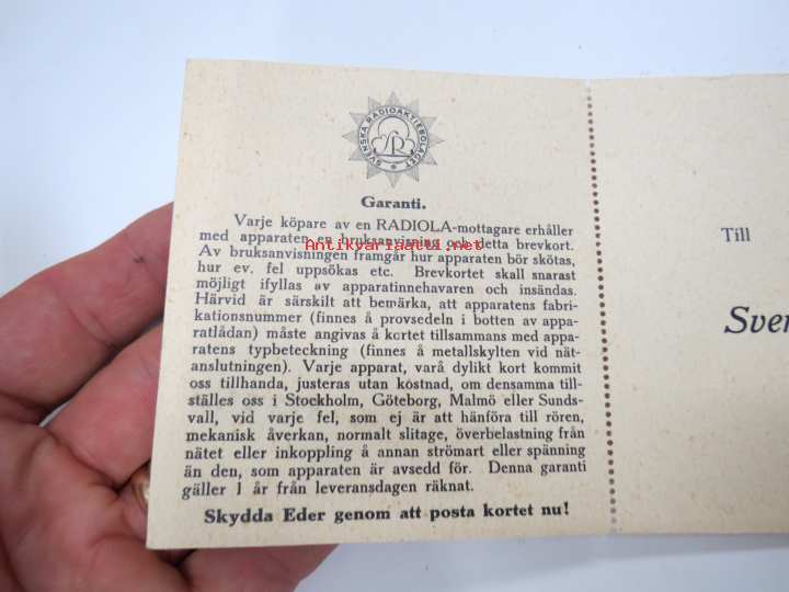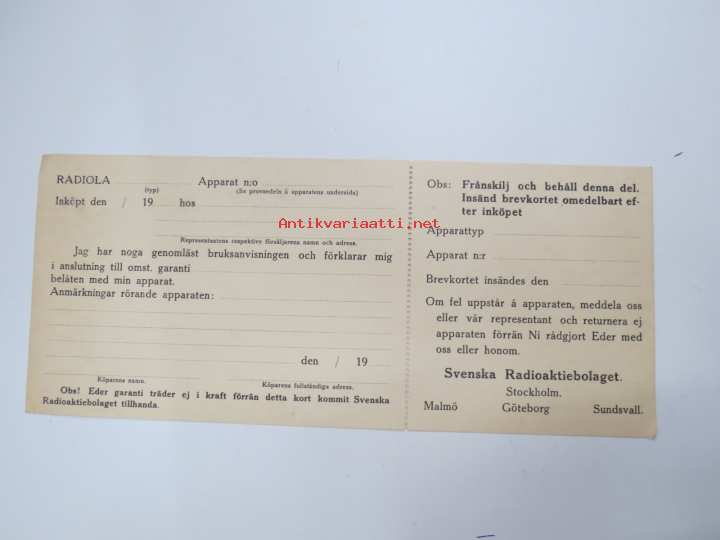 Radiola-mottagare - radio - Garantikort -takuukortti