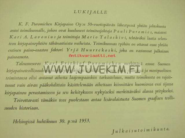 Puoli vuosisataa painettua sanaa K.F. Puromiehen Kirjapaino Oy 1903-1953