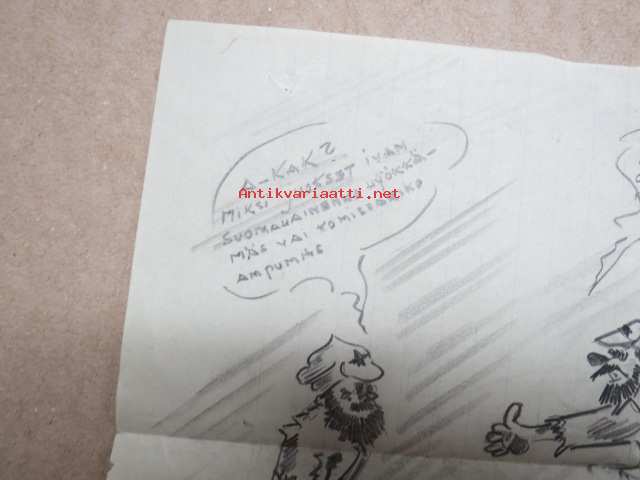 Talvisodanaikainen pilapiirros, potilaan piirtämä ja signeeraama 3.3.1940 antanut sairaanhoitaja L.R.:lle, Sotasairaalassa, Cygnaeuksen kolu, Jyväskylä