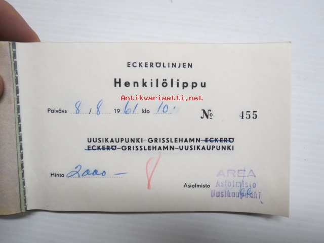 Eckerölinjen Henkilölippu nr 455 Uusikaupunki-Grisslehamn-Eckerö, käytetty 8.8.1961 -ferry ticket