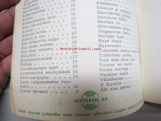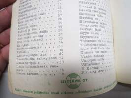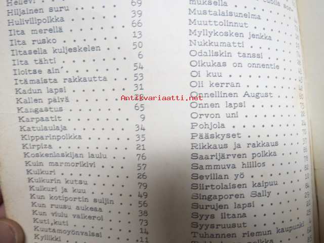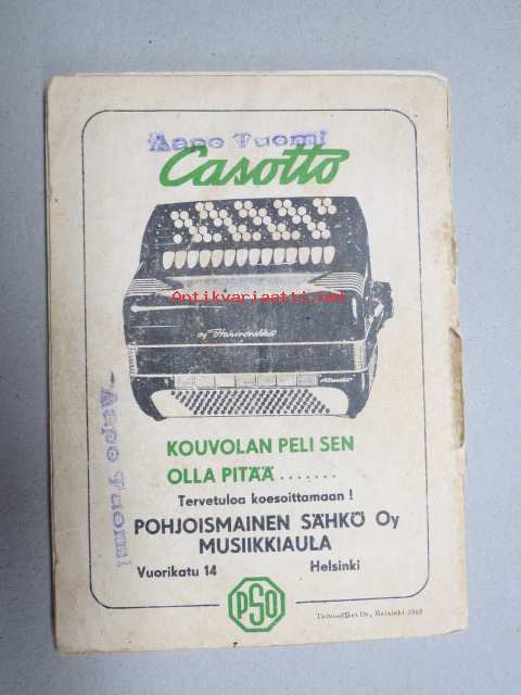 | Saatavilla | 0 kpl (Huom. tuote on myyty! / Sold out!) | | Julkaisuvuosi | 1962 | | Sivuja | 86 | | Painos | 1. | | Kunto | K2 | | Sidonta/painoasu | Nidottu (pehmeäk.) | | Kielet | Suomi |