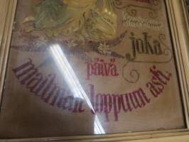 36 x 47 cm kehyksen ulkomitoin, haalistumia ym. iän merkkejä, mutta erittäin kohtuukuntoinen. Kohopainettu / -puristettu enkeli, jonka värit erittäin hyyin säilyneet. Kehyksen reunakoristeissa (kipsiä) joitakin vikoja (jotka kyllä korjattavissa). Harvinainen.