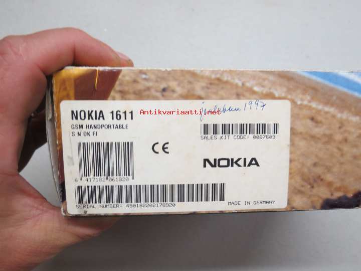 NokiaHyväkuntoinen puhelin, toimivuutta ei ole testattu, mukana SIM-kortti, merkintä ostohetkestä joulukuu 1997