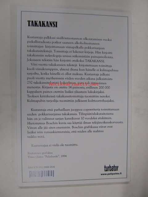 Saatavilla 1 kpl Julkaisuvuosi 2008 Sivuja 99 Painos 1. Kunto K3 Sidonta/painoasu Nidottu (pehmeäk.) ISBN 978-952-5666-23-6 Kielet Suomi