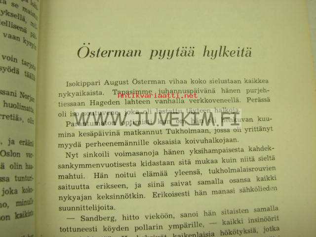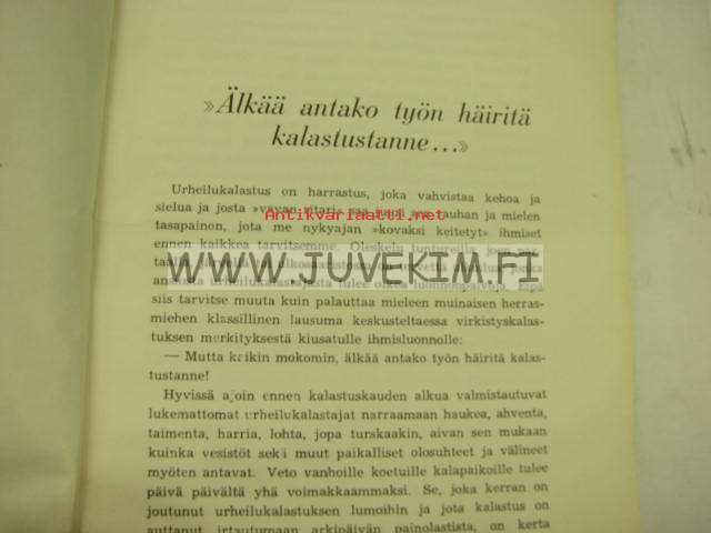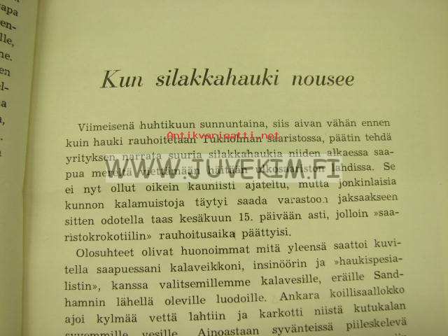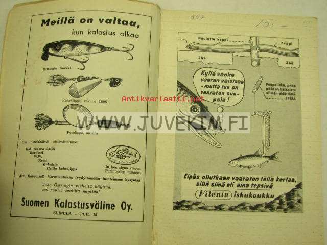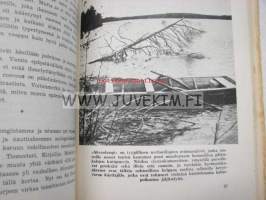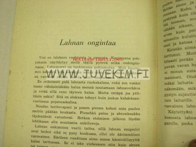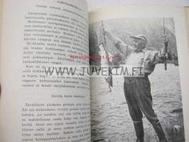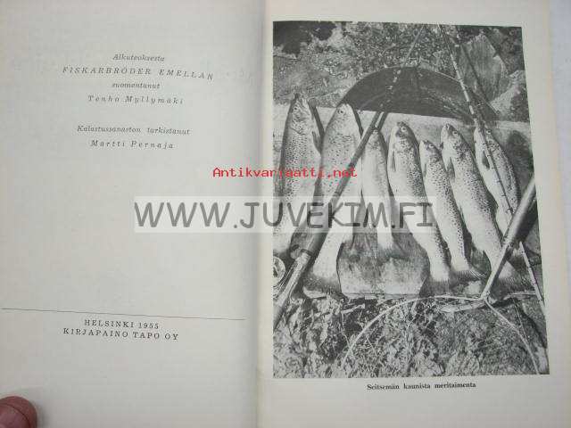 Sandberg Nisse, Kustannustalo, 1955 15 x 21 cm kirja. Alkuteos: Fiskarbröder emellan, suomentanut Tenho Myllymäki. Kalastussanaston tarkastanut Martti Pernaja. Sis. kertomuksia. Paljon mustavalkoisia valokuvia. Pehmeäkantinen, reunat kuluneet, ja takasivu sotkettu, tekstisivut hyvät.