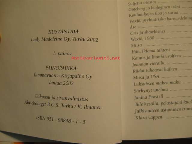 Saatavilla 1 kpl Julkaisuvuosi 2002 Sivuja 239 Painos 1. Kunto K3 Sidonta/painoasu Sidottu (kovak.) ISBN 951-98848-1-5 Kielet Suomi