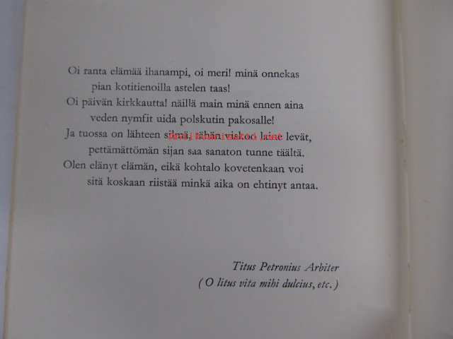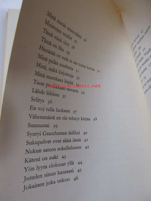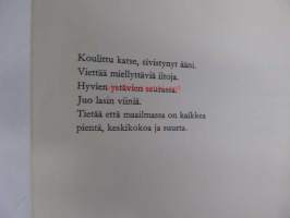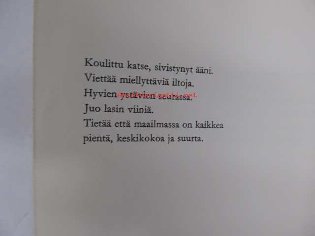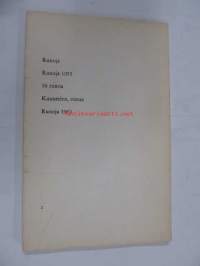 | Saatavilla | 1 kpl | | Julkaisuvuosi | 1966 | | Sivuja | 61 | | Painos | 1. | | Kunto | K3 | | Sidonta/painoasu | Nidottu (pehmeäk.) | | Kielet | Suomi |