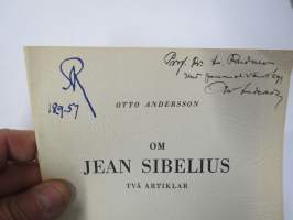 Otto Andersson - Om Jean Sibelius - Två artiklar, Särtryck ur Hbl 8.12.1956 / 3..1957 -tekijän omiste & nimikirjoitus "Till Prof. Dr. Rudner..."