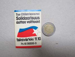 |  | Tue Chilen kansaa! Solidaarisuus auttaa voittoon! Taksvärkkipäivä - Suomi-Chile-Seura, vasemmistolainen 1970-luvun tuki- ja solidaarisuus- / varainkeruumerkki -tarra