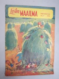Lasten Maailma 1954 nr 7, tehtäviä, tarinoita, sarjakuvia, päätoimittaja Markus Rautio, kuvituksia mm. Maija Karma, takasivu hyönteisiä heinikossa