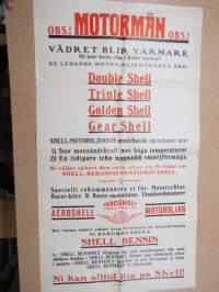 |  | Obs! Motormän Obs! - Vädret blir varmare... Double Shell / Triple Shell / Golden Shell /Gear Shell Shell Bensin - Ni kan alltid lita på Shell -mainosjuliste 1933