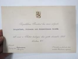 Republikens President har äran att inbjuda Bergsrådet , Friherre och Friherrinnan Palmén till soare i Slottet 6.12.1938 -kutsu itsenäisyyspäivän vastaanotolle